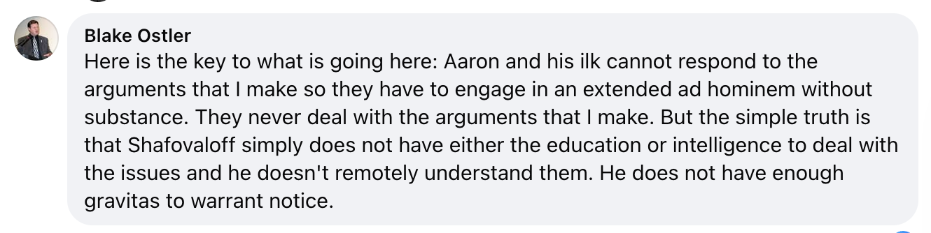 “Here is the key to what is going here: Aaron and his ilk cannot respond to the arguments that I make so they have to engage in an extended ad hominem without substance. They never deal with the arguments that I make. But the simple truth is that Shafovaloff simply does not have either the education or intelligence to deal with the issues and he doesn’t remotely understand them. He does not have enough gravitas to warrant notice.”84