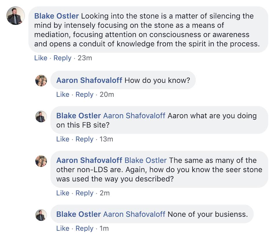- Blake Ostler. Facebook comment. “Aaron Shafovaloff has posted a comment on my views…” (April 7, 2025). Comment posted on April 9, 2025. Post link. Comment link. Screenshot. Accessed May 7, 2025. ↩︎
